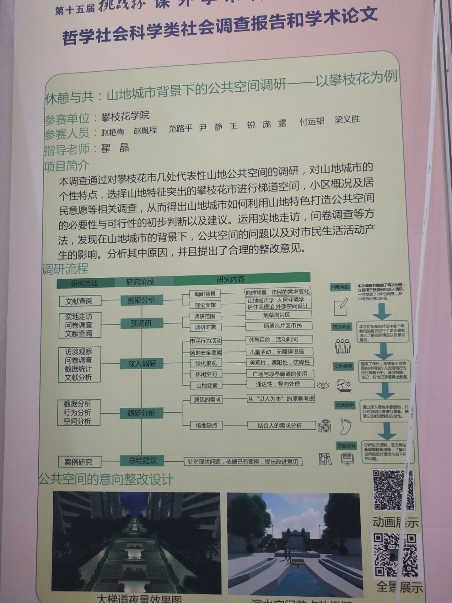 2019年6月11日,第十五届“挑战杯”四川省大学生课外学生科技作品竞赛正式落幕。我院2014级城乡规划学生作品《休‘憩’与共:山地城市背景下的公共空间调研——以攀枝花为例》在哲学社会科学类社会调查报告学术论文领域获二等奖。