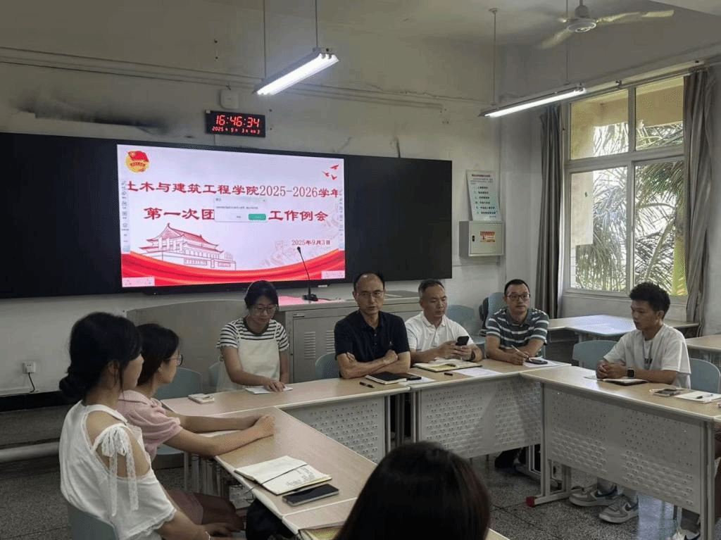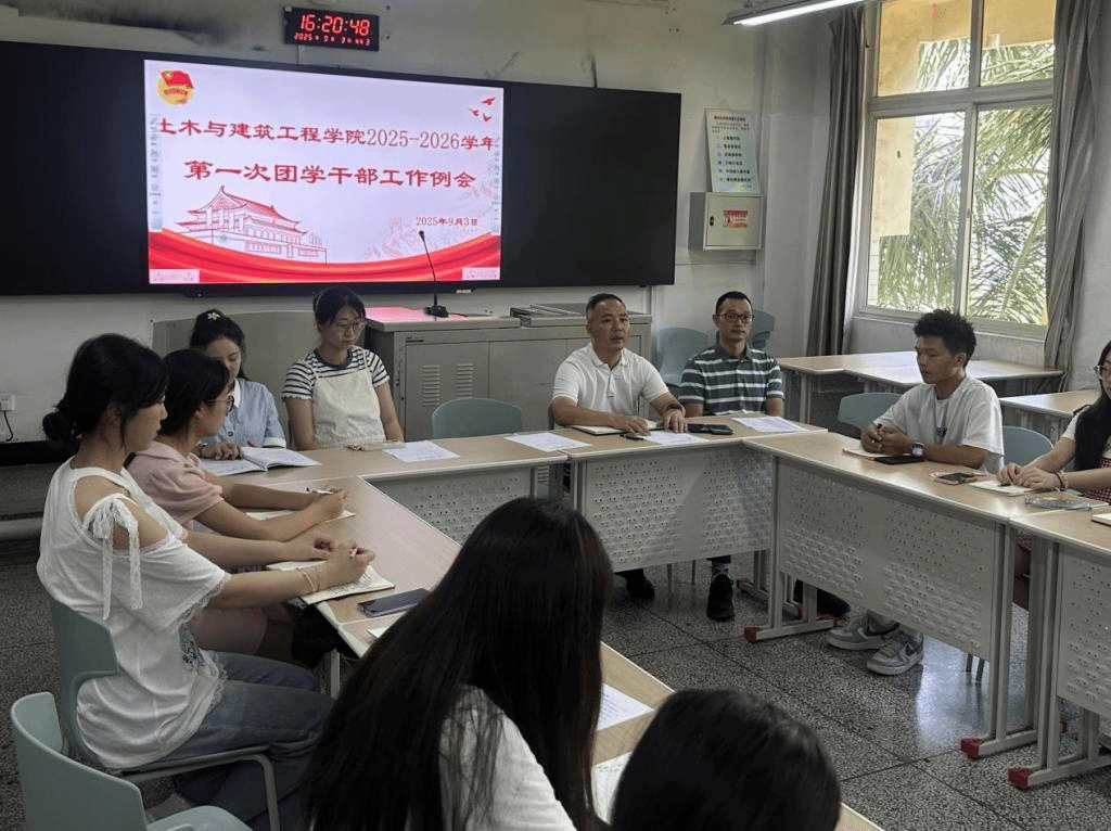 为明确新学期学院团学工作方向,确保各项工作有序开展,于2025年9月3日,土木与建筑工程学院在尚学楼2-302教室召开2025-2026学年第一次团学干部工作例会。学院党委书记薛荐戈,学院党委副书记、纪委书记付建,分团委书记杜郁美,2025级学生辅导员曾余清,2023级学生辅导员杜箫宇出席会议,土建学院第41届分团委学生会全体干部参会。