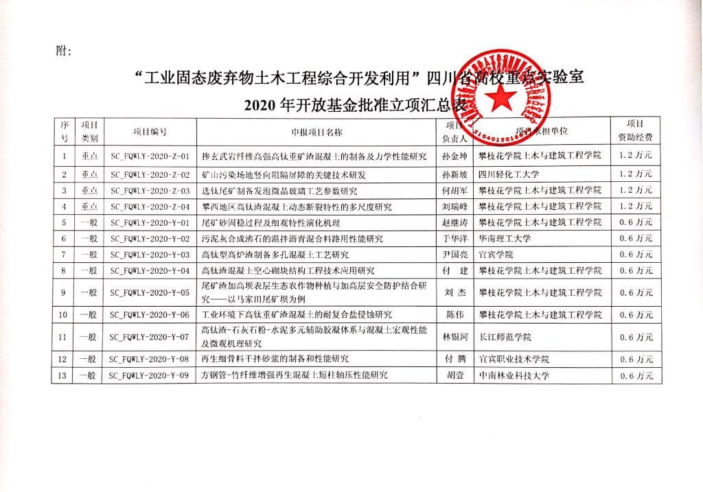 “工业固态废弃物土木工程综合开发利用”四川省高校重点实验室2020年度开放基金项目经学术委员会评审、网上公示等相关环节,特就“掺玄武岩纤维高强高钛重矿渣混凝土的制备及力学性能研究”等13个项目予以立项支持(见附件),并将相关事项通知如下,请一并遵照执行。